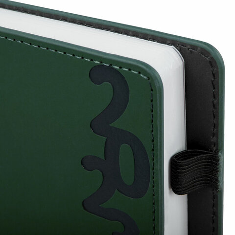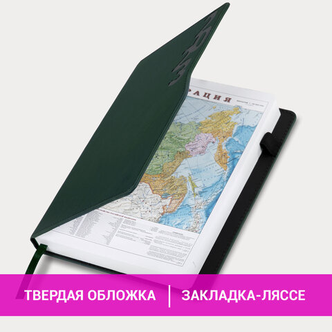 Внутренний блок включает 168 листов белой бумаги плотностью 70 г/м2. Каждая страничка имеет перфорированный угол. Благодаря стандартному формату А5 (138х213 мм) ежедневник удобно использовать как в офисе, так и на выездных деловых встречах. Жесткая книжная обложка, прошитая по периметру, с текстурой под гладкую кожу и эффектом софт-тач. Материал обложки подходит для горячего тиснения. Для удобства пользования ежедневник снабжен держателем для ручки. Форзац ежедневника представлен картами мира и России. Дополнением является закладка-ляссе, с помощью которой при необходимости можно быстро открыть ежедневник на нужной странице. Помимо прочего, ежедневник снабжен обширным справочным материалом. Выполнен в благородном зеленом цвете.