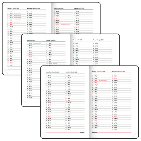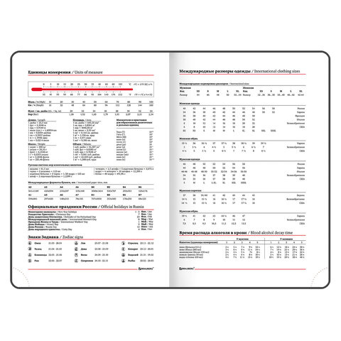 Внутренний блок включает 168 листов белой бумаги плотностью 70 г/м2. Каждая страничка имеет перфорированный угол. Благодаря стандартному формату А5 (138х213 мм) ежедневник удобно использовать как в офисе, так и на выездных деловых встречах. Мягкая интегральная обложка стилизована под гладкую кожу. Материал обложки подходит для горячего тиснения. Цветной форзац и срез придает ежедневнику особый шарм. Дополнением является закладка-ляссе, с помощью которой при необходимости можно быстро открыть ежедневник на нужной странице. Помимо прочего, ежедневник снабжен обширным справочным материалом.