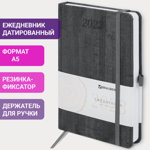 Ежедневник датированный 2023 А5 138x213 мм BRAUBERG 'Wood', под кожу, серый, 114077