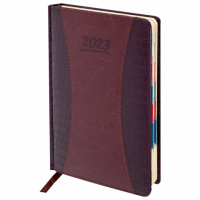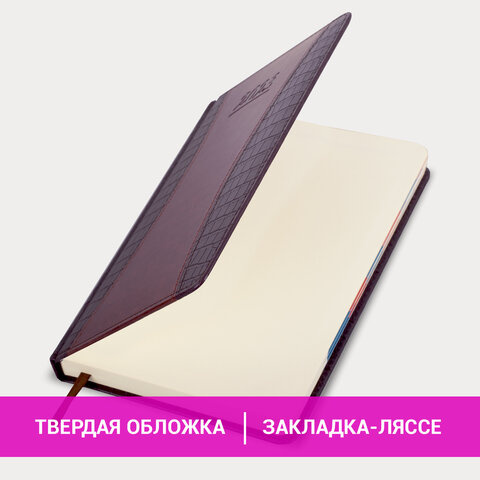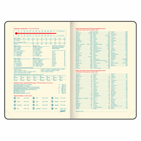 Внутренний блок включает 168 листов тонированной бумаги плотностью 70 г/м2. Каждая страничка имеет перфорированный угол. Благодаря стандартному формату А5 (148х218 мм) ежедневник удобно использовать как в офисе, так и на выездных деловых встречах. Твердая обложка состоит из двух материалов и стилизована под кожу крокодила с вставкой из материала под гладкую кожу. Материал обложки подходит для горячего тиснения. Дополнением является закладка-ляссе, с помощью которой при необходимости можно быстро открыть ежедневник на нужной странице, а также вырубка по месяцам. Помимо прочего, ежедневник снабжен обширным справочным материалом. Выполнен в благородном коричневом цвете.