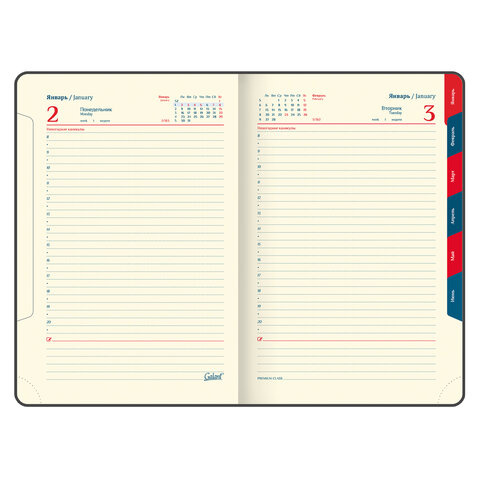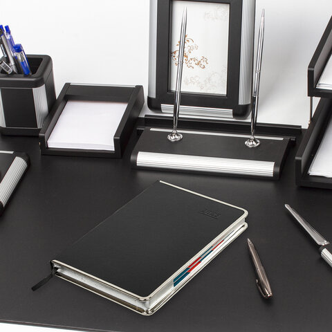 Внутренний блок включает 168 листов тонированной бумаги цвета 'слоновая кость' плотностью 70 г/м2. Каждая страничка имеет перфорированный угол. Благодаря стандартному формату А5 (148х218 мм) ежедневник удобно использовать как в офисе, так и на выездных деловых встречах. Твердая обложка выполнена под гладкую кожу с отделкой из металлических накладок, благодаря чему увеличивается ее износоустойчивость. Срез ежедневника покрыт серебряной фольгой в цвет металлических накладок, что придает ему особый шарм. Материал обложки подходит для горячего тиснения. Дополнением является закладка-ляссе, с помощью которой при необходимости можно быстро открыть ежедневник на нужной странице, а также вырубка по месяцам. Помимо прочего, ежедневник снабжен обширным справочным материалом. Выполнен в классическом черном цвете.