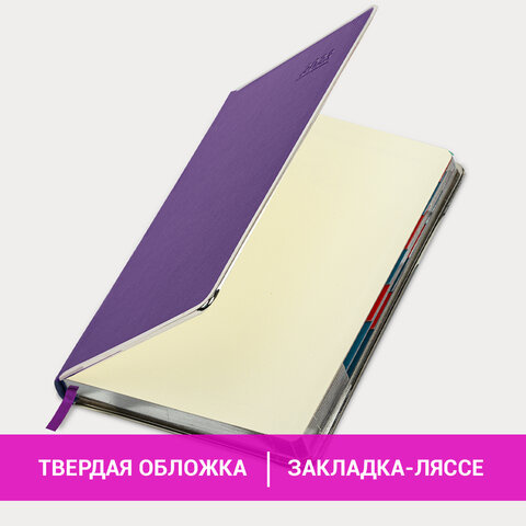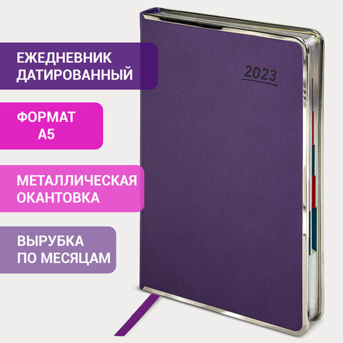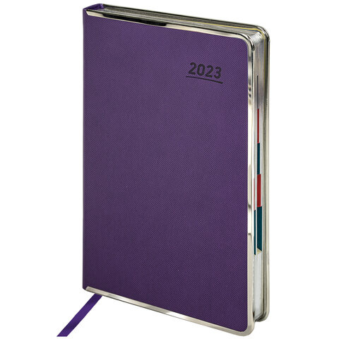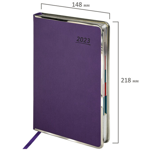 Внутренний блок включает 168 листов тонированной бумаги цвета 'слоновая кость' плотностью 70 г/м2. Каждая страничка имеет перфорированный угол. Благодаря стандартному формату А5 (148х218 мм) ежедневник удобно использовать как в офисе, так и на выездных деловых встречах. Твердая обложка выполнена под гладкую кожу с отделкой из металлических накладок, благодаря чему увеличивается ее износоустойчивость. Срез ежедневника покрыт серебряной фольгой в цвет металлических накладок, что придает ему особый шарм. Материал обложки подходит для горячего тиснения. Дополнением является закладка-ляссе, с помощью которой при необходимости можно быстро открыть ежедневник на нужной странице, а также вырубка по месяцам. Помимо прочего, ежедневник снабжен обширным справочным материалом. Выполнен в фиолетовом цвете.