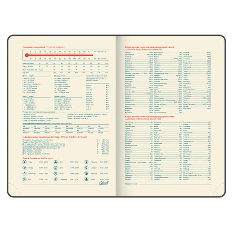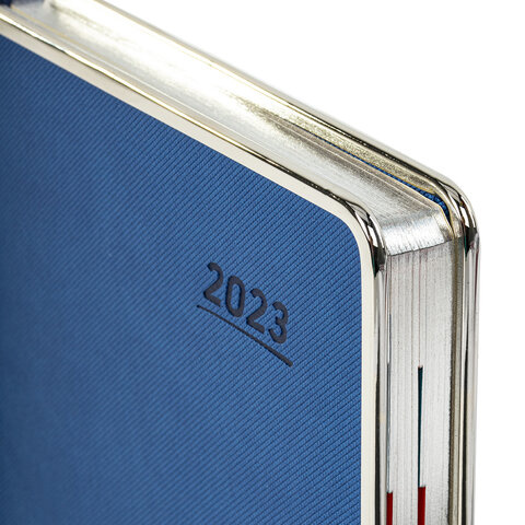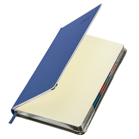 Внутренний блок включает 168 листов тонированной бумаги цвета 'слоновая кость' плотностью 70 г/м2. Каждая страничка имеет перфорированный угол. Благодаря стандартному формату А5 (148х218 мм) ежедневник удобно использовать как в офисе, так и на выездных деловых встречах. Твердая обложка выполнена под гладкую кожу с отделкой из металлических накладок, благодаря чему увеличивается ее износоустойчивость. Срез ежедневника покрыт серебряной фольгой в цвет металлических накладок, что придает ему особый шарм. Материал обложки подходит для горячего тиснения. Дополнением является закладка-ляссе, с помощью которой при необходимости можно быстро открыть ежедневник на нужной странице, а также вырубка по месяцам. Помимо прочего, ежедневник снабжен обширным справочным материалом. Выполнен в классическом синем цвете.