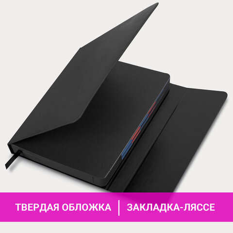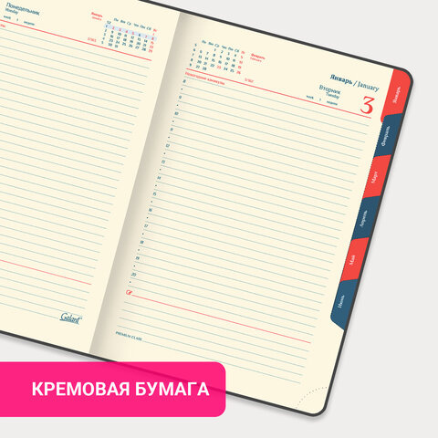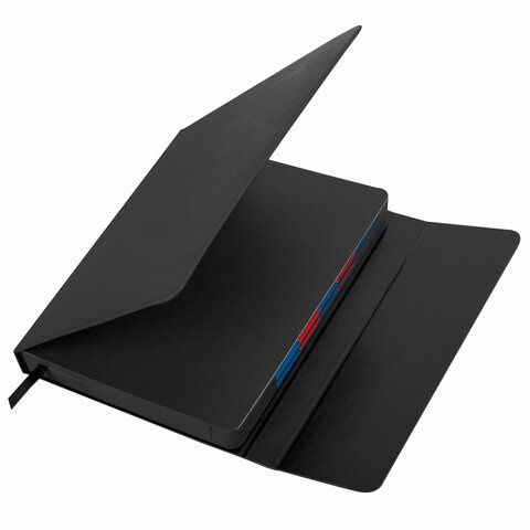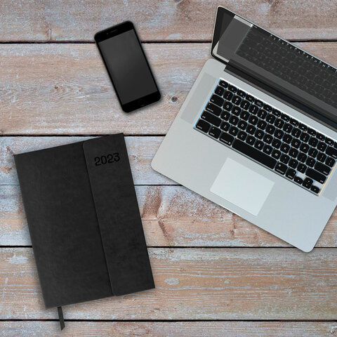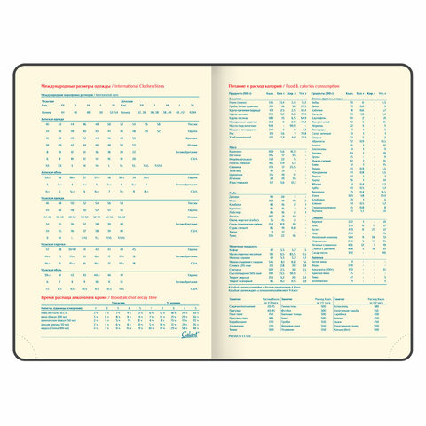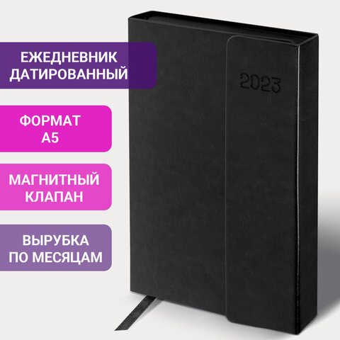 Внутренний блок включает 168 листов тонированной бумаги плотностью 70 г/м2. Каждая страничка имеет перфорированный угол. Благодаря стандартному формату А5 (148х218 мм) ежедневник удобно использовать как в офисе, так и на выездных деловых встречах. Интегральная обложка стилизована под гладкую кожу, фиксируется магнитным клапаном, поэтому ежедневник не откроется в сумке или портфеле и страницы не помнутся. Подходит для горячего тиснения. Срез и форзац ежедневника окрашены в цвет обложки, что придает ему особый шарм. Дополнением является закладка-ляссе, с помощью которой при необходимости можно быстро открыть ежедневник на нужной странице, а также вырубка по месяцам. Помимо прочего, ежедневник снабжен обширным справочным материалом. Выполнен в классическом черном цвете.