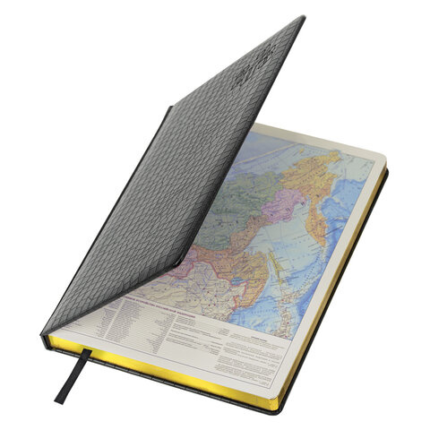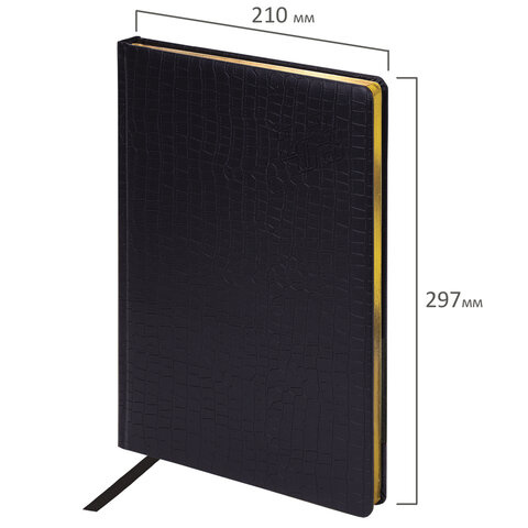 Внутренний блок включает 168 листов тонированной бумаги плотностью 70 г/м2. Каждая страничка имеет перфорированный угол. Благодаря большому формату А4 (210x297 мм) ежедневник удобно использовать как в офисе, так и на выездных деловых встречах. Твердая обложка стилизована под кожу крокодила классического черного цвета. Материал обложки подходит для горячего тиснения. Форзац ежедневника представлен картами мира и России. Срез ежедневника фольгирован золотой фольгой, что придает ему особый шарм. Дополнением является закладка-ляссе, с помощью которой при необходимости можно быстро открыть ежедневник на нужной странице. Помимо прочего, ежедневник снабжен обширным справочным материалом.