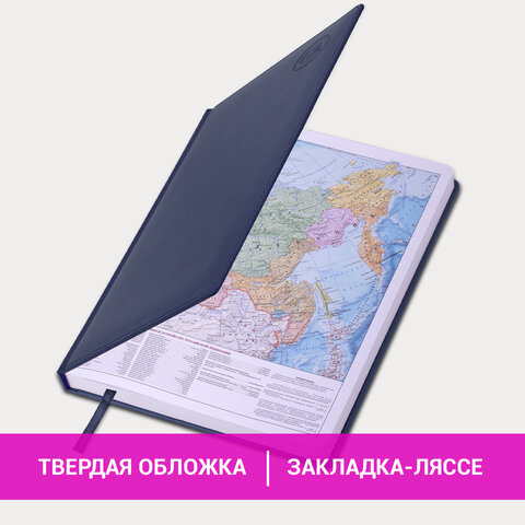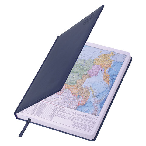 Внутренний блок включает 168 листов белой бумаги плотностью 70 г/м2. Каждая страничка имеет перфорированный угол. Благодаря большому формату А4 (210х297 мм) ежедневник удобно использовать как в офисе, так и на выездных деловых встречах. Твердая обложка стилизована под фактурную кожу благородного синего цвета и прошита по периметру. Материал обложки подходит для горячего тиснения. Форзац ежедневника представлен картами мира и России. Дополнением является закладка-ляссе, с помощью которой при необходимости можно быстро открыть ежедневник на нужной странице. Помимо прочего, ежедневник снабжен обширным справочным материалом.