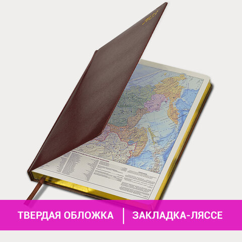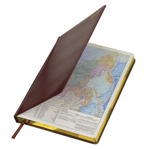 Внутренний блок включает 168 листов тонированной бумаги плотностью 70 г/м2. Каждая страничка имеет перфорированный угол. Благодаря большому формату А4 (210х297 мм) ежедневник удобно использовать как в офисе, так и на выездных деловых встречах. Твердая обложка стилизована под кожу рептилии благородного коричневого цвета. Подходит для горячего тиснения. Срез ежедневника фольгирован золотой фольгой, что придает ему особый шарм. Форзац ежедневника представлен картами мира и России. Дополнением является закладка-ляссе, с помощью которой при необходимости можно быстро открыть ежедневник на нужной странице. Помимо прочего, ежедневник снабжен обширным справочным материалом.