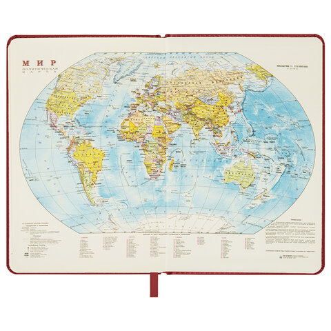 Внутренний блок включает 168 листов тонированной бумаги плотностью 70 г/м2. Каждая страничка имеет перфорированный угол. Благодаря большому формату А4 (210х297 мм) ежедневник удобно использовать как в офисе, так и на выездных деловых встречах. Твердая обложка стилизована под кожу рептилии красного цвета. Подходит для горячего тиснения. Срез ежедневника фольгирован золотой фольгой, что придает ему особый шарм. Форзац ежедневника представлен картами мира и России. Дополнением является закладка-ляссе, с помощью которой при необходимости можно быстро открыть ежедневник на нужной странице. Помимо прочего, ежедневник снабжен обширным справочным материалом.