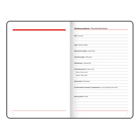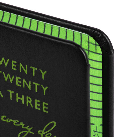Внутренний блок включает 168 листов белой бумаги плотностью 70 г/м2. Каждая страничка имеет перфорированный угол. Благодаря стандартному формату А6 (100х150 мм) ежедневник удобно использовать как в офисе, так и на выездных деловых встречах. Жесткая книжная обложка стилизована под гладкую кожу черного цвета. Материал обложки подходит для горячего тиснения и при лазерной гравировке меняет цвет на зеленый. Срез ежедневника окрашен в цвет термотиснения, а форзац в цвет обложки, что придает ему особый шарм. Дополнением является закладка-ляссе, с помощью которой при необходимости можно быстро открыть ежедневник на нужной странице. Помимо прочего, ежедневник снабжен обширным справочным материалом.