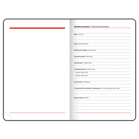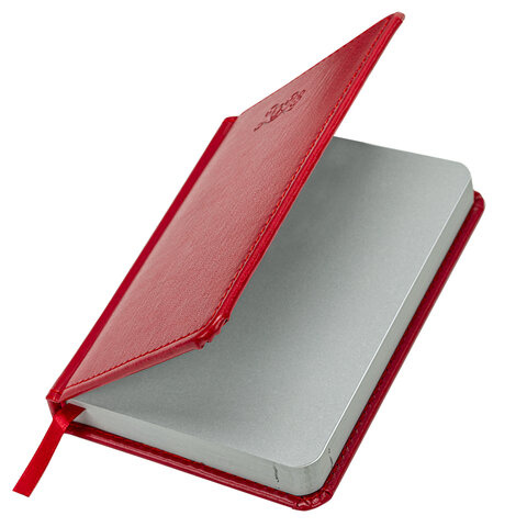 Внутренний блок включает 168 листов белой бумаги плотностью 70 г/м2. Каждая страничка имеет перфорированный угол. Благодаря малому формату А6 (100х150 мм) ежедневник удобно использовать как в офисе, так и на выездных деловых встречах. Твердая обложка стилизована под гладкую кожу яркого красного цвета. Подходит для горячего тиснения. Срез и форзац ежедневника окрашены на контрасте с цветом обложки, что придает ему особый шарм. Дополнением является закладка-ляссе, с помощью которой при необходимости можно быстро открыть ежедневник на нужной странице. Помимо прочего, ежедневник снабжен обширным справочным материалом.