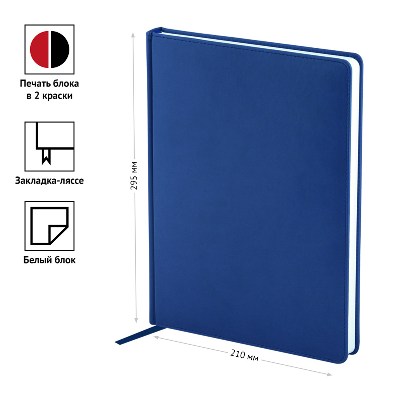 Ежедневник датированный формата А4 из коллекции «Winner». Обложка изготовлена из высококачественного кожзаменителя с гладкой мягкой матовой поверхностью, с поролоновой прослойкой, цвет обложки - синий. Подходит для всех видов полиграфического тиснения. Внутренний блок состоит из 176 листов офсетной бумаги плотностью 70 г/м2, печать блока в 2 краски, справочный материал. На форзацах географические карты России и Мира. Удобная закладка-ляссе и перфорированные уголки.