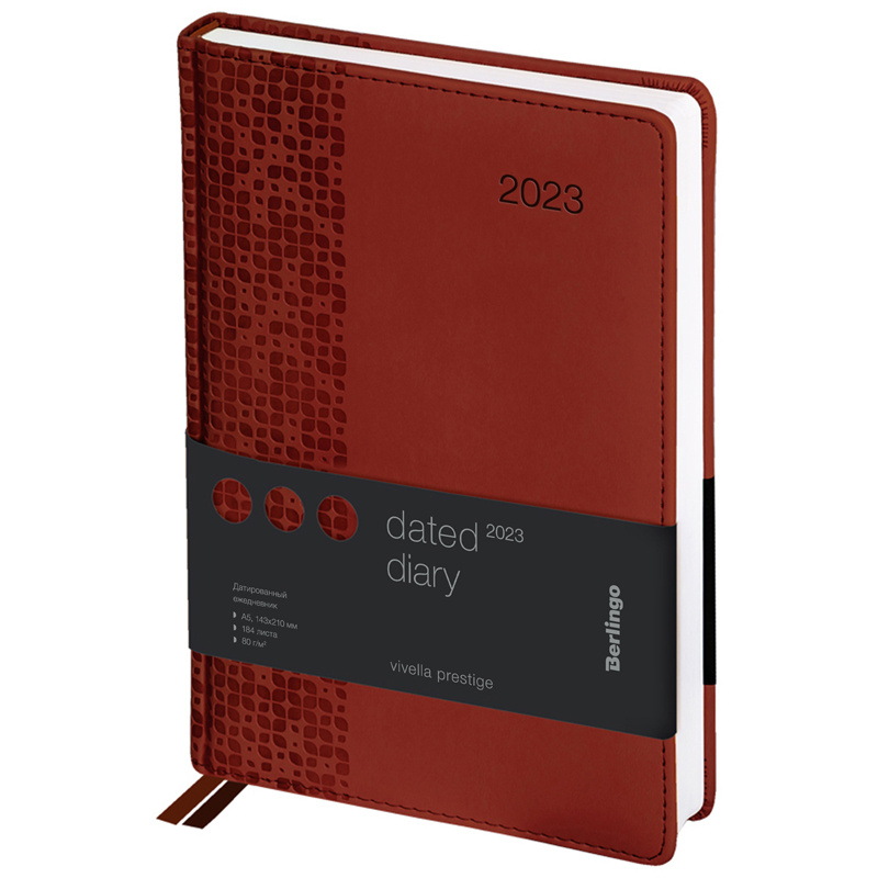 Стильный датированный ежедневник на 2023 год Berlingo Vivella Prestige формата А5 (150*215 мм) с твёрдой с классической твердой матовой обложкой из коричневой высококачественной экокожи. Имиджевое тиснение на обложке добавляет интересную деталь в насыщенной цвет обложки.