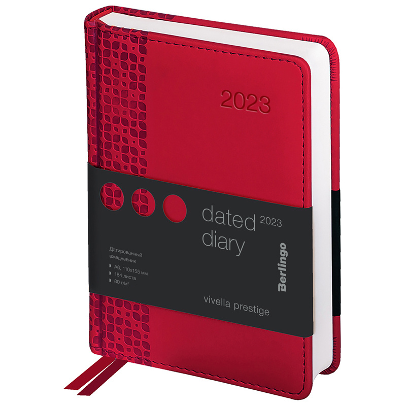 Стильный датированный ежедневник на 2023 год Berlingo Vivella Prestige формата А6 (115*160 мм) с твёрдой с классической твердой матовой обложкой из красной высококачественной экокожи. Имиджевое тиснение на обложке добавляет интересную деталь в насыщенной цвет обложки.