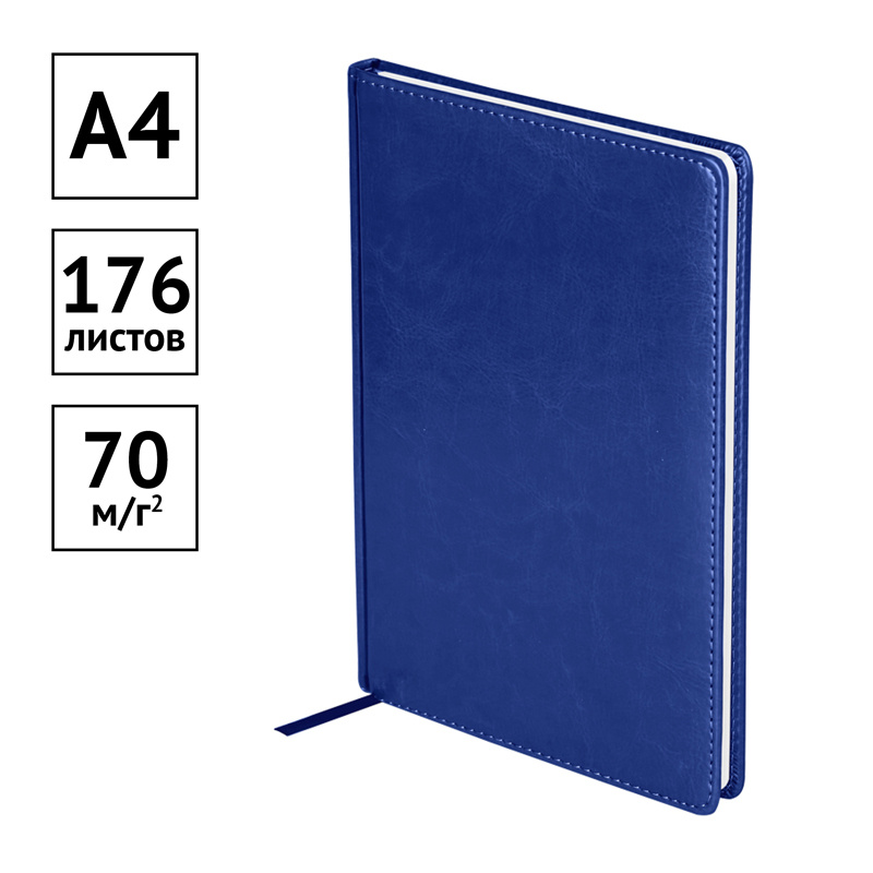 Ежедневник датированный формата А4 из коллекции «Nebraska». Обложка изготовлена из высококачественного кожзаменителя, имитирующего натуральную глянцевую кожу, с поролоновой прослойкой, цвет обложки - синий. Подходит для всех видов полиграфического тиснения. Внутренний блок состоит из 176 листов офсетной бумаги плотностью 70 г/м2, печать блока в 2 краски, справочный материал. Удобная закладка-ляссе и перфорированные уголки.