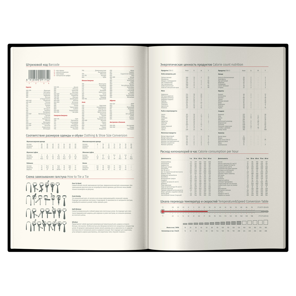 Высококачественная кремовая бумага повышенной плотности 80 г/м2, пантонная печать блока в 2 краски, справочный материал. 184 листа. Перфорированные уголки блока, 2 закладки-ляссе, отрывные заметки и бланки-извещения о ДТП. Вырубной блок по неделям. Подарочная матовая индивидуальная упаковка. В подарок 3 комплекта стикеров.