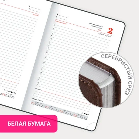 Внутренний блок включает 168 листов белой бумаги плотностью 70 г/м2. Каждая страничка имеет перфорированный угол. Благодаря стандартному формату А5 (138х213 мм) ежедневник удобно использовать как в офисе, так и на выездных деловых встречах.