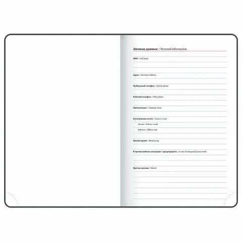 Внутренний блок включает 168 листов белой бумаги плотностью 70 г/м2. Каждая страничка имеет перфорированный угол. Благодаря стандартному формату А5 (138х213 мм) ежедневник удобно использовать как в офисе, так и на выездных деловых встречах.