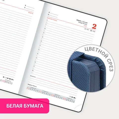 Внутренний блок включает 168 листов белой бумаги плотностью 70 г/м2. Каждая страничка имеет перфорированный угол. Благодаря стандартному формату А5 (138х213 мм) датированный ежедневник удобно использовать как в офисе, так и на выездных деловых встречах.