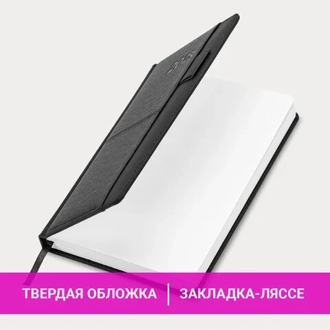 Внутренний блок включает 168 листов белой бумаги плотностью 70 г/м2. Каждая страничка имеет перфорированный угол. Благодаря стандартному формату А5 (138х213 мм) датированный ежедневник удобно использовать как в офисе, так и на выездных деловых встречах. Твердая обложка стилизована под кожу и выполнена в черном цвете. Подходит для горячего тиснения.