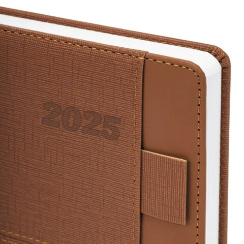 Твердая обложка стилизована под кожу и выполнена в классическом коричневом цвете. Подходит для горячего тиснения. Дополнением является закладка-ляссе, с помощью которой при необходимости можно быстро открыть ежедневник на нужной странице. Имеются держатель для ручки и карман для разных мелочей, расположенный на передней стороне обложки.