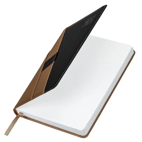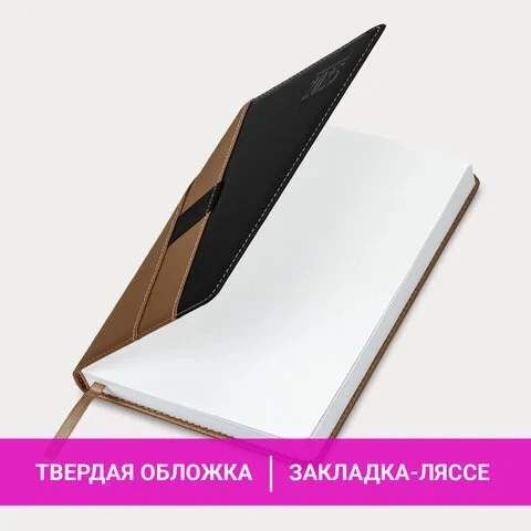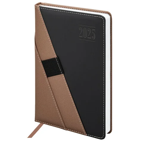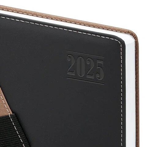 Выполнен в стильном сочетании коричневого и черного цветов. Обложка подходит для горячего тиснения. Дополнением является закладка-ляссе, с помощью которой при необходимости можно быстро открыть ежедневник на нужной странице и держателем для ручки. Ежедневник снабжен справочным материалом. В конце имеются 4 страницы для записей и заметок.