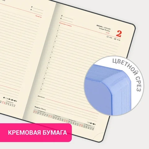 Внутренний блок включает 168 листов кремовой бумаги плотностью 70 г/м2. Каждая страничка имеет перфорированный угол. Благодаря стандартному формату А5 (138х213 мм) ежедневник удобно использовать как в офисе, так и на выездных деловых встречах.