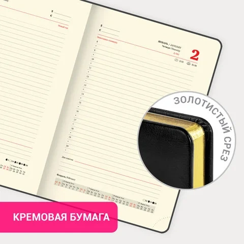 Внутренний блок включает 168 листов тонированной бумаги плотностью 70 г/м2. Каждая страничка имеет перфорированный угол. Благодаря стандартному формату А5 (138х213 мм) ежедневник удобно использовать как в офисе, так и на выездных деловых встречах. Твердая обложка состоит из двух материалов и стилизована под кожу крокодила в сочетании с гладкой кожей. Подходит для горячего тиснения. Срез ежедневника фольгирован золотой фольгой, что придает ему особый шарм.