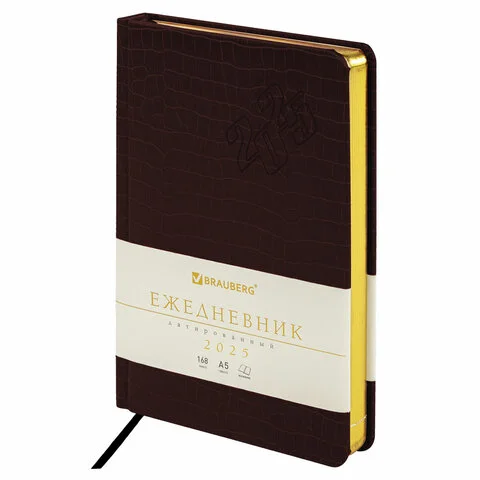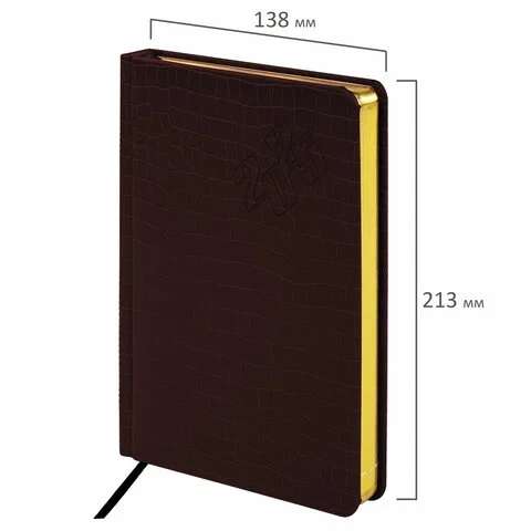 Внутренний блок включает 168 листов тонированной бумаги плотностью 70 г/м2. Каждая страничка имеет перфорированный угол. Благодаря стандартному формату А5 (138х213 мм) ежедневник удобно использовать как в офисе, так и на выездных деловых встречах. Материал обложки благородного коричневого цвета подходит для горячего тиснения. Срез ежедневника фольгирован золотой фольгой, что придает ему особый шарм.