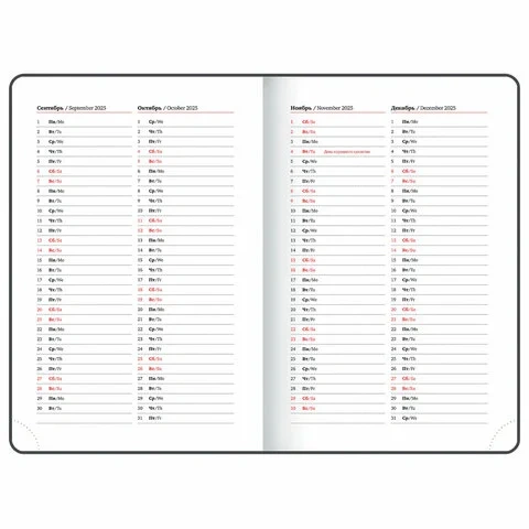 Внутренний блок включает 168 листов белой бумаги плотностью 70 г/м2. Каждая страничка имеет перфорированный угол. Благодаря стандартному формату А5 (138х213 мм) датированный ежедневник удобно использовать как в офисе, так и на выездных деловых встречах.