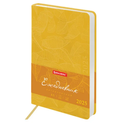 Ежедневник датированный 2025, А5, 138x213 мм, BRAUBERG 'Foliage', под кожу гибкий, желтый, 115853