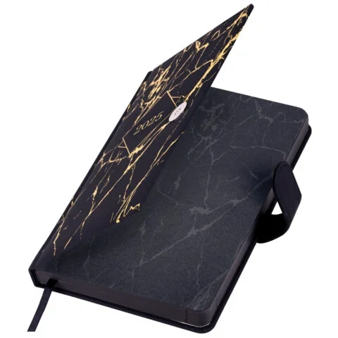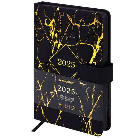 Ежедневник датированный 2025 А5 138x213 мм BRAUBERG 'Goldy', под кожу, цветной срез, черный, 115898
