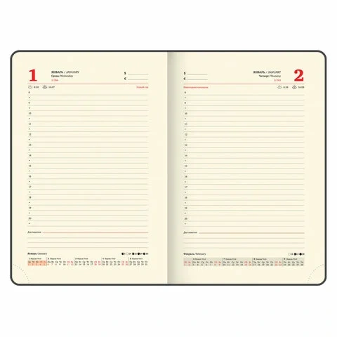 Ежедневник снабжен обширным справочным материалом. В конце имеются 4 страницы для записей и заметок.