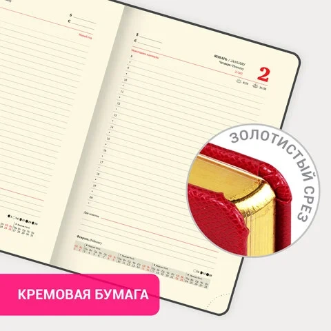 Внутренний блок включает 168 листов тонированной бумаги плотностью 70 г/м2. Каждая страничка имеет перфорированный угол. Благодаря стандартному формату А5 ежедневник удобно использовать как в офисе, так и на выездных деловых встречах. Твердая обложка стилизована под кожу рептилии. Подходит для горячего тиснения. Срез ежедневника фольгирован золотой фольгой, что придает ему особый шарм.