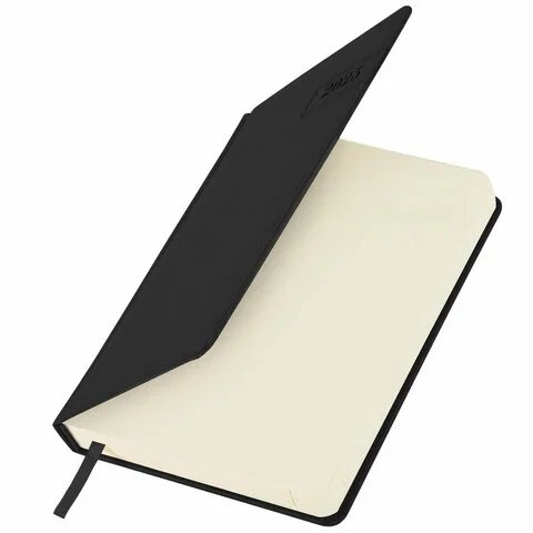 Внутренний блок включает 168 листов тонированной бумаги плотностью 70 г/м2. Каждая страничка имеет перфорированный угол. Благодаря стандартному формату А5 (138х213 мм) ежедневник удобно использовать как в офисе, так и на выездных деловых встречах.Твердая обложка стилизована под гладкую кожу строгого черного цвета. Материал обложки подходит для горячего тиснения. Дополнением является закладка-ляссе, с помощью которой при необходимости можно быстро открыть ежедневник на нужной странице.