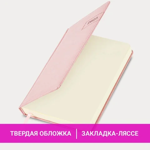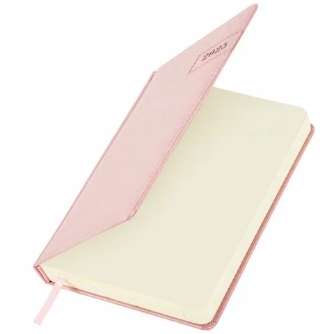 Твердая обложка стилизована под гладкую кожу нежного розового цвета. Материал обложки подходит для горячего тиснения. Дополнением является закладка-ляссе, с помощью которой при необходимости можно быстро открыть ежедневник на нужной странице.