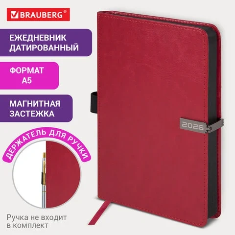 Ежедневник датированный 2025, А5, 138x213 мм, BRAUBERG 'Inspiration', под кожу, цветной срез, красны