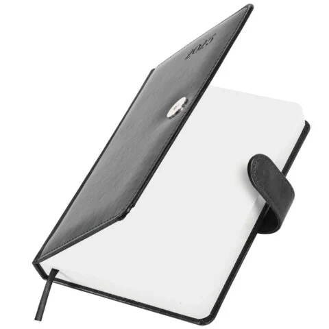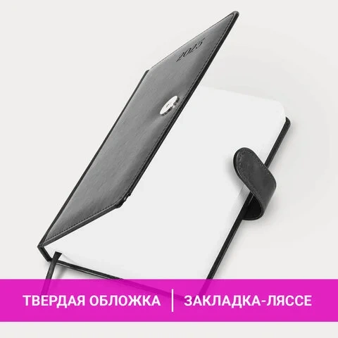 Жесткая книжная обложка прошита по периметру, имеет легкую рельефную фактуру и напоминает натуральную кожу. Материал обложки подходит для горячего тиснения. Обложка фиксируется магнитной застежкой, поэтому ежедневник не откроется в сумке или портфеле и страницы не помнутся.