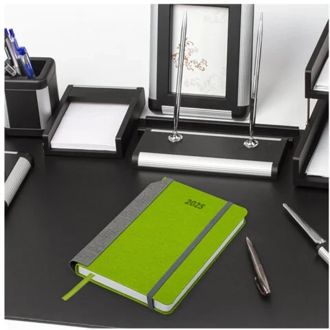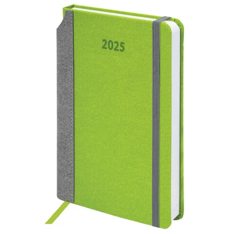 Выполнен в стильном сочетании зеленого и серого цветов. Жесткая книжная обложка стилизована под искусственную кожу с текстурой льна, фиксируется резинкой, поэтому ежедневник не откроется в сумке или портфеле и страницы не помнутся. Материал обложки подходит для горячего тиснения. Для удобства пользования ежедневник снабжен карманом для фиксации ручки. Дополнением является закладка-ляссе, с помощью которой при необходимости можно быстро открыть ежедневник на нужной странице.