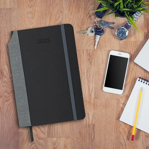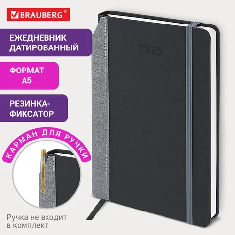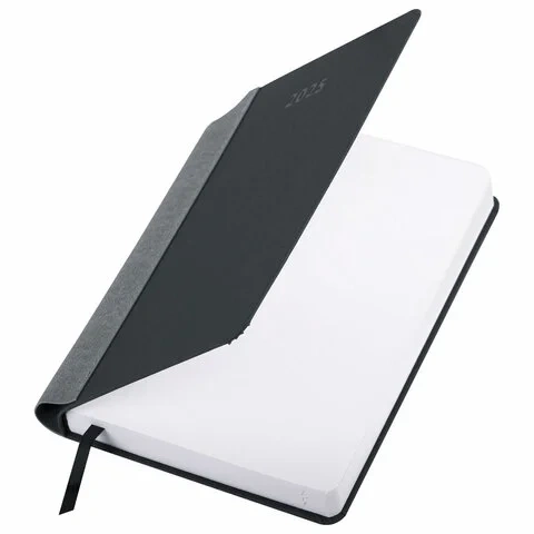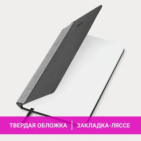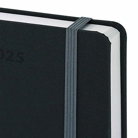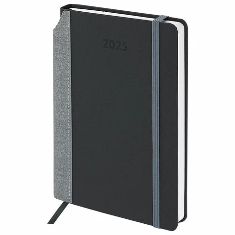 Выполнен в стильном сочетании черного и серого цветов. Жесткая книжная обложка стилизована под искусственную кожу с текстурой льна, фиксируется резинкой, поэтому ежедневник не откроется в сумке или портфеле и страницы не помнутся. Материал обложки подходит для горячего тиснения. Для удобства пользования ежедневник снабжен карманом для фиксации ручки. Дополнением является закладка-ляссе, с помощью которой при необходимости можно быстро открыть ежедневник на нужной странице.