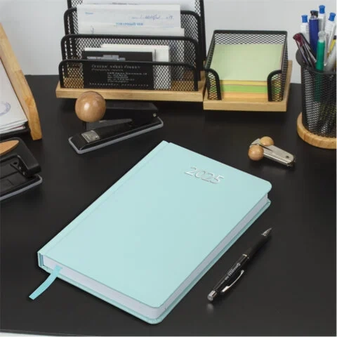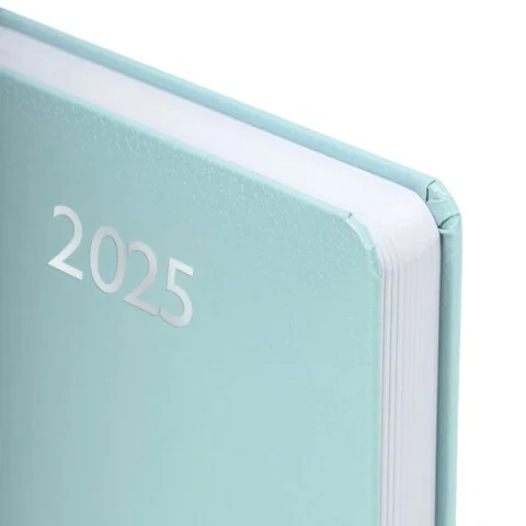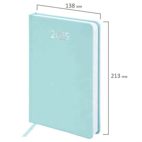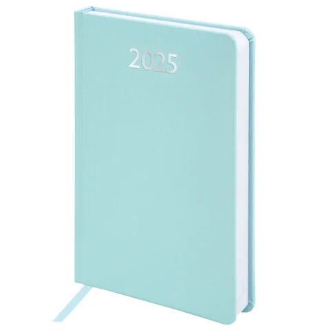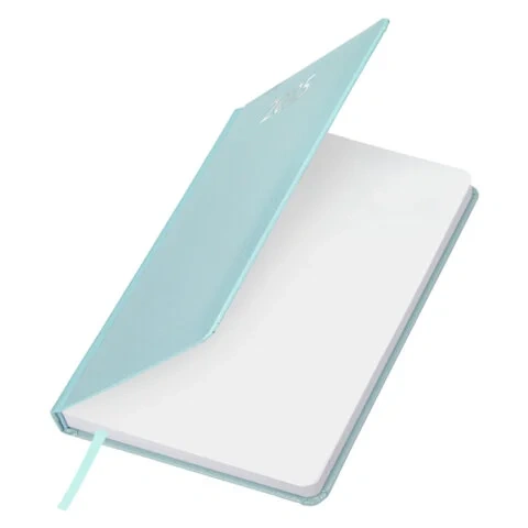 Внутренний блок включает 168 листов белой бумаги плотностью 70 г/м2. Каждая страничка имеет перфорированный угол. Благодаря стандартному формату А5 (138х213 мм) ежедневник удобно использовать как в офисе, так и на выездных деловых встречах. Жесткая книжная обложка с легкой рельефной фактурой напоминает натуральную кожу нежного мятного оттенка. Материал обложки – балакрон, подходит для тиснения только фольгой.