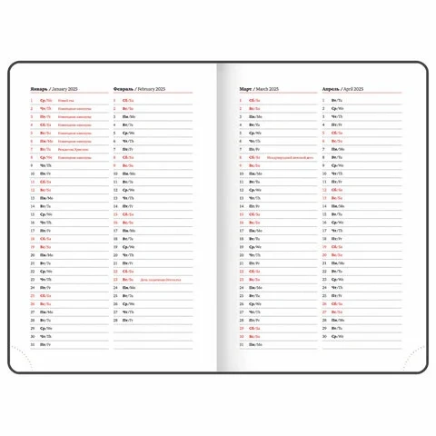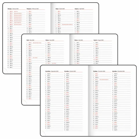 Твердая обложка стилизована под гладкую кожу насыщенного черного цвета. Подходит для горячего тиснения. Срез и форзац ежедневника окрашены на контрасте с цветом обложки, что придает ему особый шарм. Дополнением является закладка-ляссе, с помощью которой при необходимости можно быстро открыть ежедневник на нужной странице. Помимо прочего, ежедневник снабжен обширным справочным материалом. В конце имеются 4 страницы для записей и заметок.