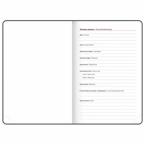 Внутренний блок включает 168 листов белой бумаги плотностью 70 г/м2. Каждая страничка имеет перфорированный угол. Благодаря стандартному формату А5 (138х213 мм) ежедневник удобно использовать как в офисе, так и на выездных деловых встречах.