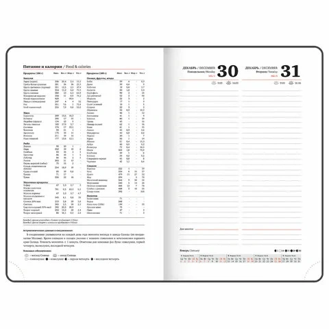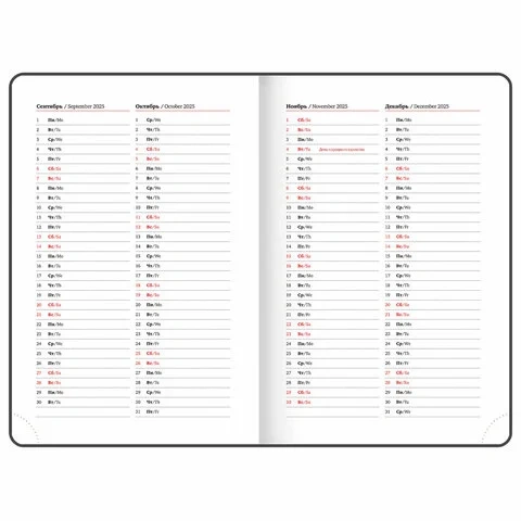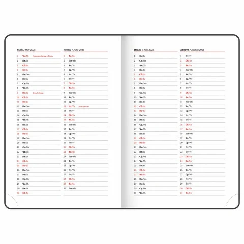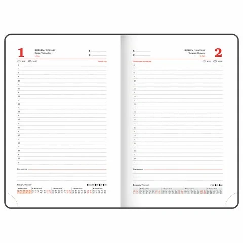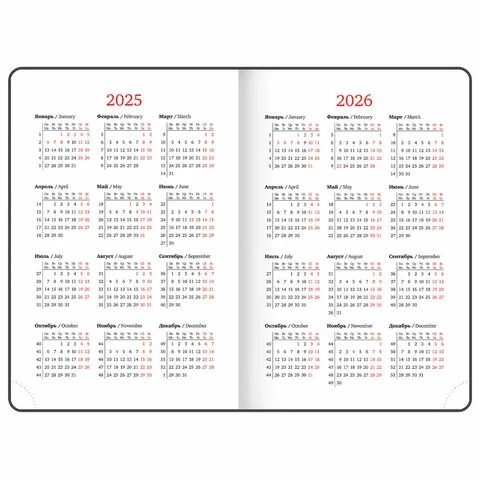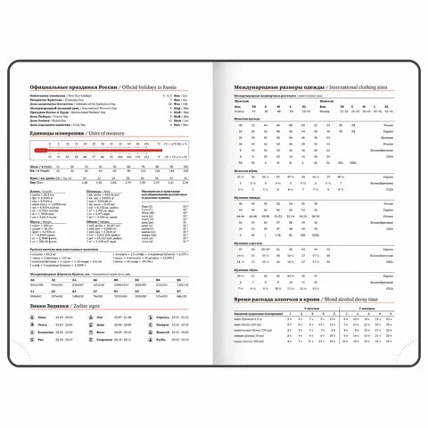 Внутренний блок включает 168 листов белой бумаги плотностью 70 г/м2. Каждая страничка имеет перфорированный угол. Благодаря стандартному формату А5 (138х213 мм) ежедневник удобно использовать как в офисе, так и на выездных деловых встречах.