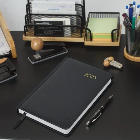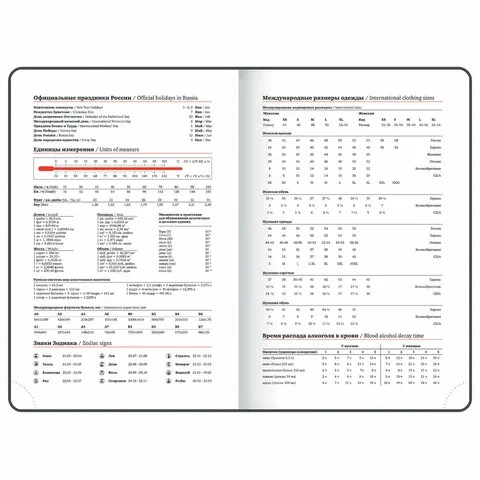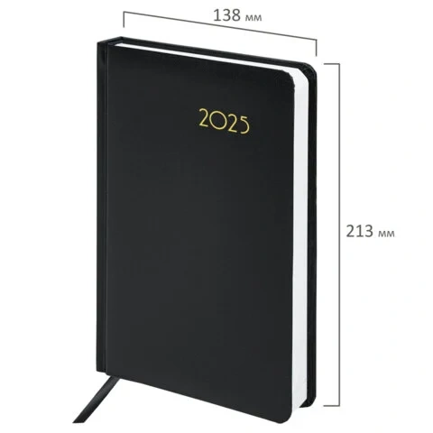 Внутренний блок включает 168 листов белой бумаги плотностью 70 г/м2. Каждая страничка имеет перфорированный угол. Благодаря стандартному формату А5 (138х213 мм) ежедневник удобно использовать как в офисе, так и на выездных деловых встречах.