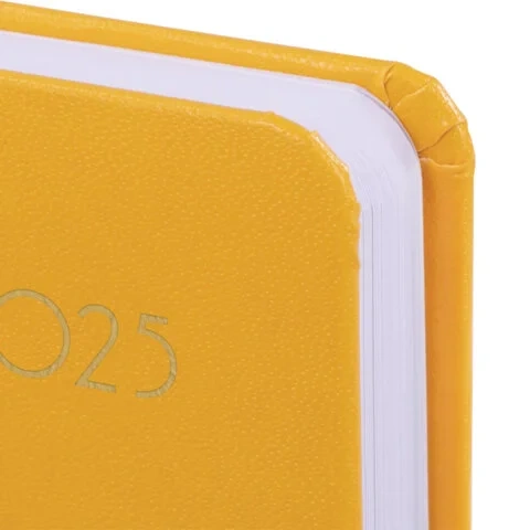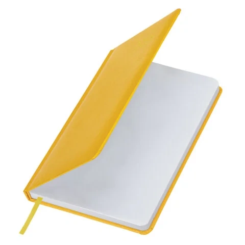 Имеет приятную на ощупь обложку желтого цвета с гладкой матовой поверхностью. Жесткая книжная обложка с легкой рельефной фактурой напоминает натуральную кожу. Материал обложки – балакрон, подходит для тиснения только фольгой. Дополнением является закладка-ляссе, с помощью которой при необходимости можно быстро открыть ежедневник на нужной странице. Помимо прочего, ежедневник снабжен обширным справочным материалом. В конце имеются 4 страницы для записей и заметок.