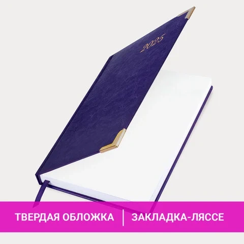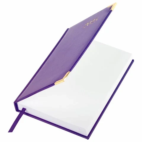 Твердая обложка фиолетового цвета, стилизованная под гладкую кожу. Подходит для горячего тиснения. Ежедневник имеет металлические уголки, что придает ему особый шарм. Дополнением является закладка-ляссе, с помощью которой при необходимости можно быстро открыть ежедневник на нужной странице. Помимо прочего, ежедневник снабжен обширным справочным материалом. В конце имеются 4 страницы для записей и заметок.