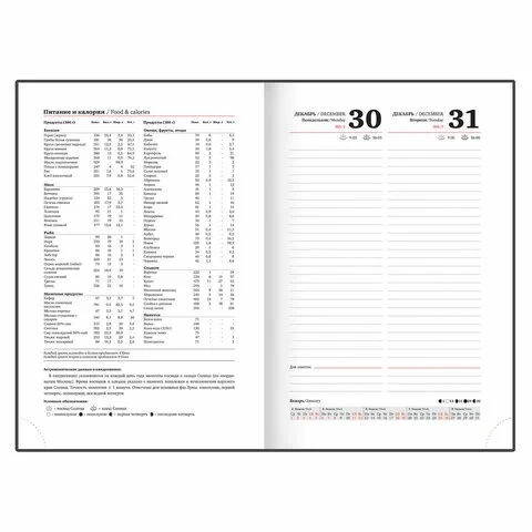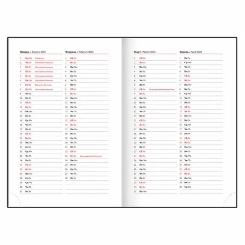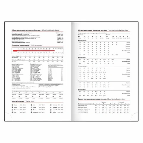Внутренний блок включает 168 листов белой бумаги плотностью 70 г/м2. Каждая страничка имеет перфорированный угол. Благодаря стандартному формату А5 (138х213 мм) ежедневник удобно использовать как в офисе, так и на выездных деловых встречах.