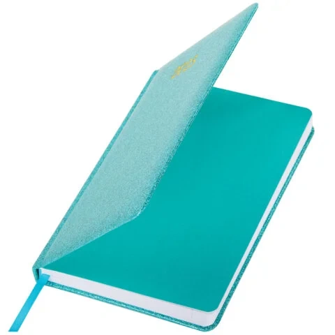Внутренний блок включает 168 листов белой бумаги плотностью 70 г/м2. Каждая страничка имеет перфорированный угол. Благодаря стандартному формату А5 (138х213 мм) ежедневник удобно использовать как в офисе, так и на выездных деловых встречах. Твердая обложка стилизована под кожу с глиттером неординарного бирюзового цвета. Подходит для тиснения фольгой. Дополнением является закладка-ляссе, с помощью которой при необходимости можно быстро открыть ежедневник на нужной странице. Ежедневник снабжен справочным материалом.