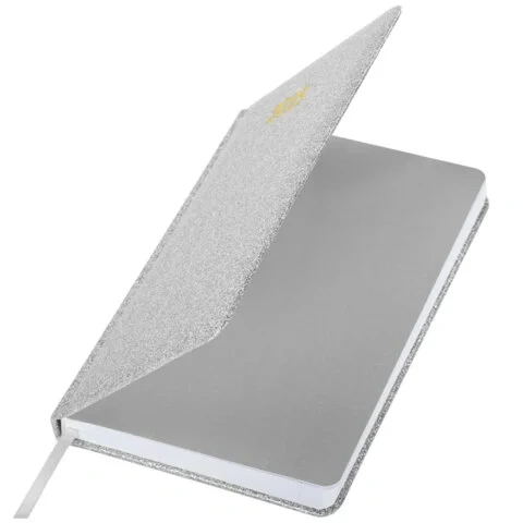 Внутренний блок включает 168 листов белой бумаги плотностью 70 г/м2. Каждая страничка имеет перфорированный угол. Благодаря стандартному формату А5 (138х213 мм) ежедневник удобно использовать как в офисе, так и на выездных деловых встречах. Твердая обложка стилизована под кожу с глиттером благородного серебряного цвета. Подходит для тиснения фольгой. Дополнением является закладка-ляссе, с помощью которой при необходимости можно быстро открыть ежедневник на нужной странице. Ежедневник снабжен справочным материалом.