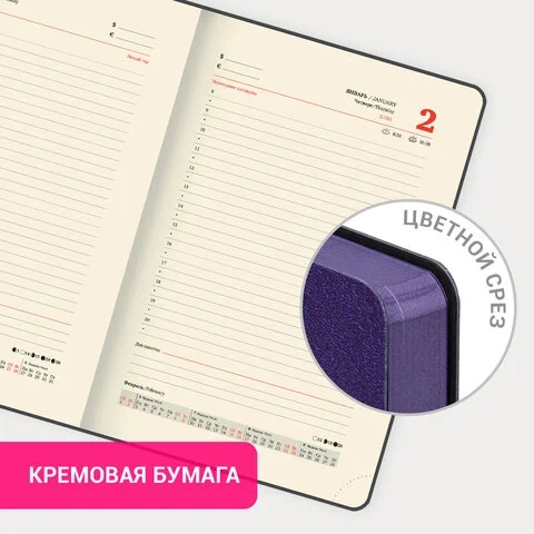 Внутренний блок включает 168 листов тонированной бумаги плотностью 70 г/м2. Каждая страничка имеет перфорированный угол. Благодаря стандартному формату А5 (138х213 мм) ежедневник удобно использовать как в офисе, так и на выездных деловых встречах. Мягкая (интегральная) обложка стилизована под фактурную кожу яркого фиолетового цвета. Подходит для горячего тиснения. Дополнением является закладка-ляссе, с помощью которой при необходимости можно быстро открыть ежедневник на нужной странице. Ежедневник снабжен справочным материалом.